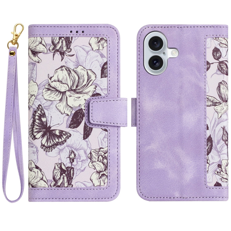 Funda de Cuero para iPhone 16 con Estampado Floral y Cordón (Morado Claro)