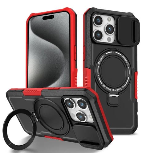 Funda para Teléfono iPhone 15 Pro Max Sliding Camshield Magsafe Holder TPU Hybrid (Negro Rojo)