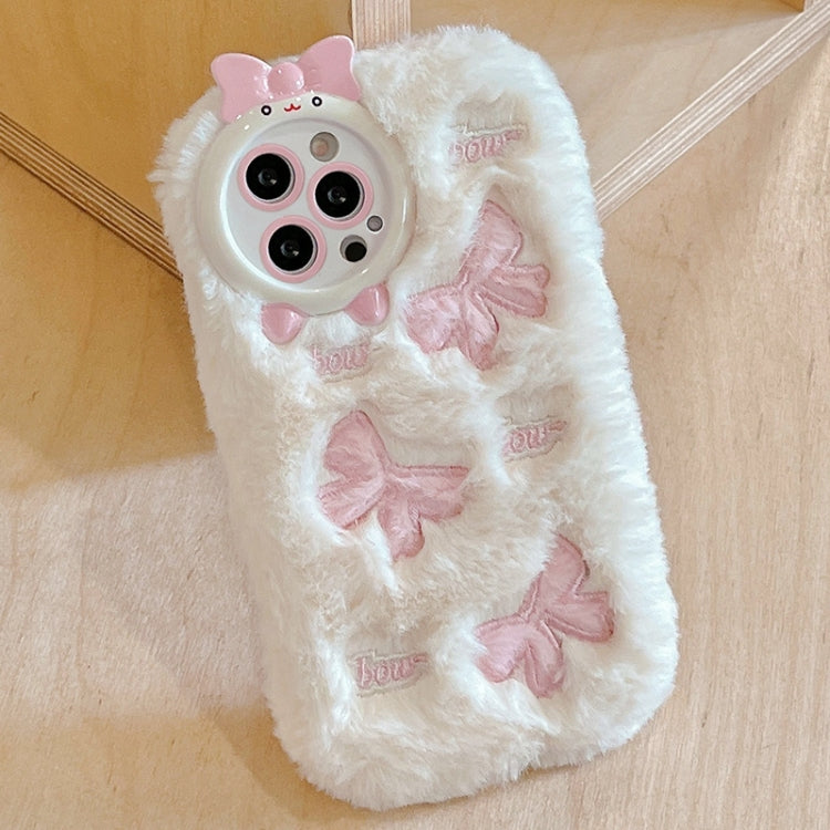 Funda de Teléfono iPhone 16 Pro Bordado Felpa Cobertura Total (Blanco + Lazo Rosa)