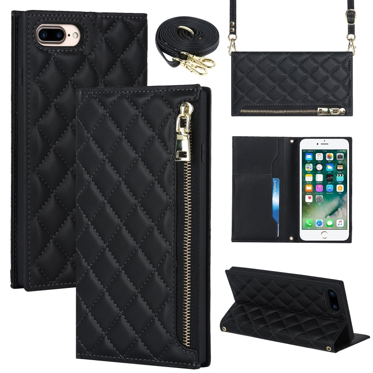 Funda de Cuero con Cremallera para iPhone 8 Plus y 7 Plus Grid Texture Lanyard (Marrón)