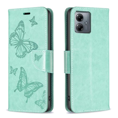 Funda de Cuero para Motorola Moto G14 4G con Estampado de Dos Mariposas (Verde)
