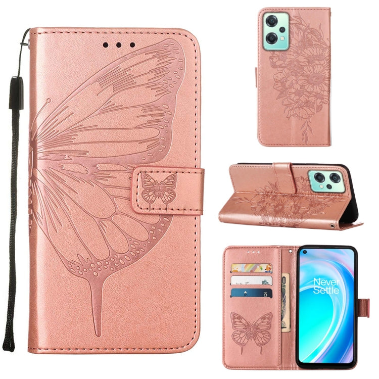 Funda de Cuero para OnePlus Nord 2T 5G con Mariposa en Relieve (Oro Rosa)