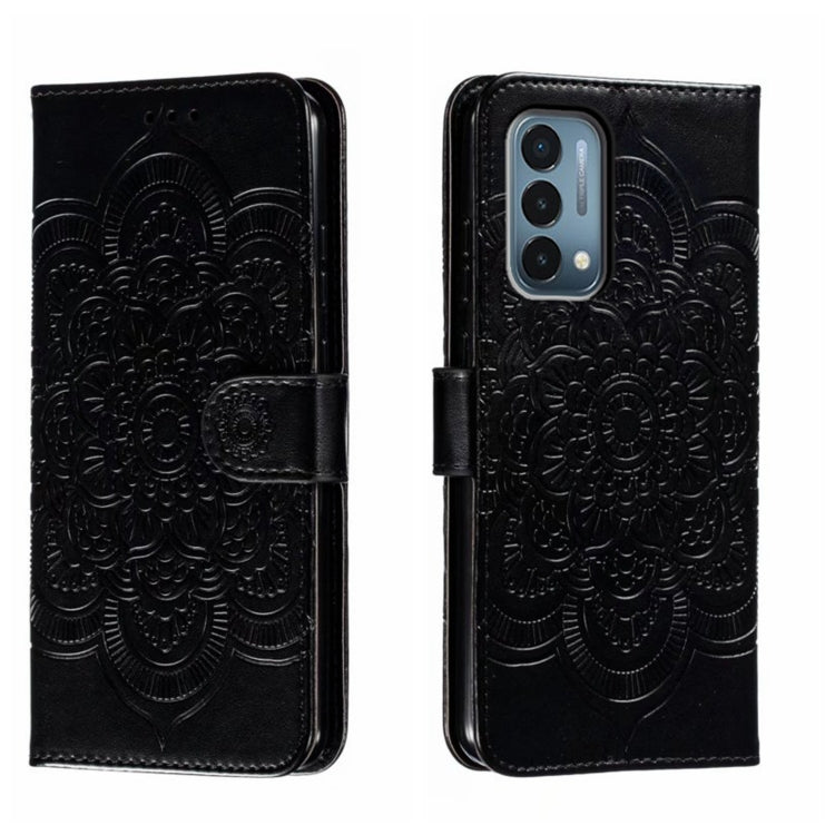 Funda de Cuero para OnePlus Nord N200 5G con Patrón En Relieve Sun Mandala (Negro)