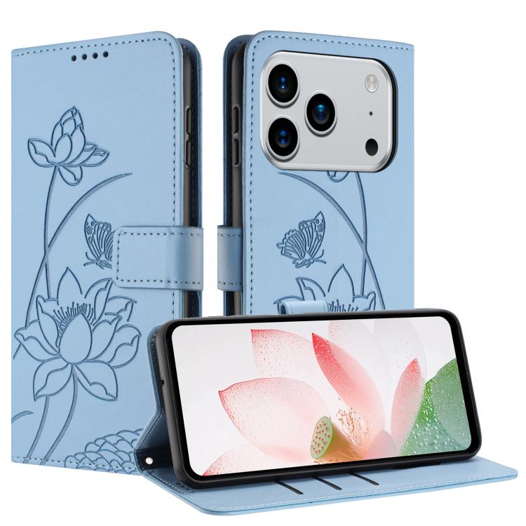 Funda de piel con relieve de loto para iPhone 17 Pro con cordón (azul)