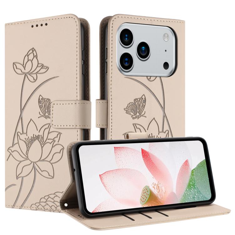 Funda de piel con relieve de loto para iPhone 17 Pro con cordón (beige)