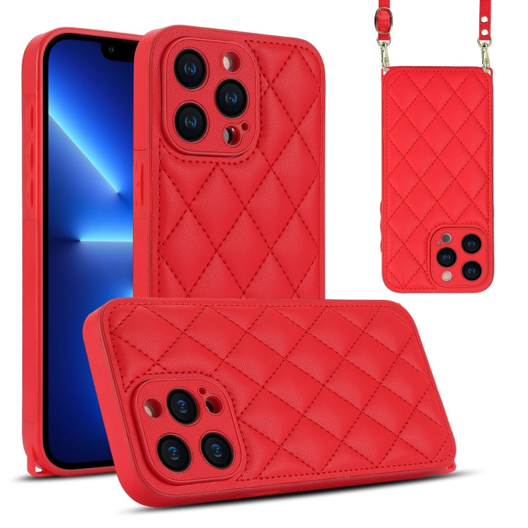 Estuche para Teléfono iPhone 13 Pro Textura Rómbica y Cordón Doble (Rojo)