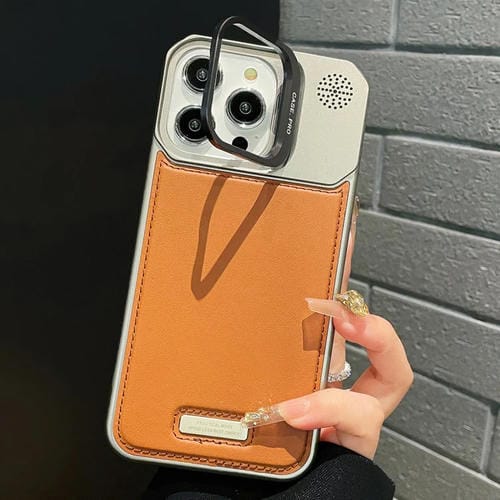 Funda de Cuero para iPhone 16 Pro Max con Tapa de Metal y Función Atril (Marrón)