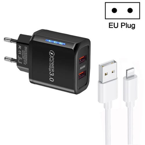 Cargador USB QC3.0 Doble Puerto 36W con Cable USB a 8 Pines 3A (Negro)