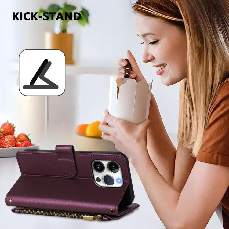 Funda de cuero con cremallera para iPhone 16 Pro, diseño de mariposas, flores y amor (morado oscuro)