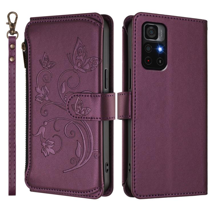 Funda de cuero con cremallera para Redmi Note 11S 5G / Xiaomi Poco M4 Pro 5G, diseño de mariposas y flores, con múltiples tarjetas (morado oscuro)