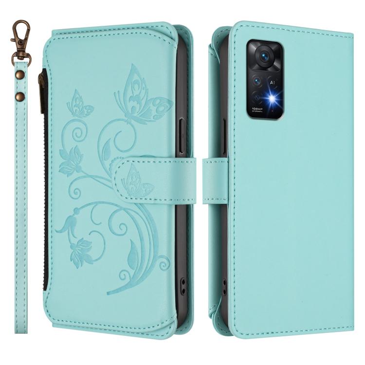 Funda de cuero con cremallera para Redmi Note 12 Pro 4G / Note 11 Pro 5G, diseño de mariposas y flores, con múltiples tarjetas (verde menta)