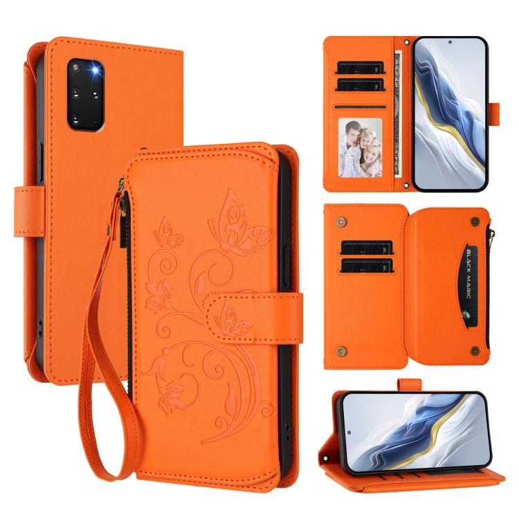 Funda de cuero con cremallera para Samsung Galaxy S20+, diseño de mariposas, flores y amor, con múltiples tarjetas (naranja)