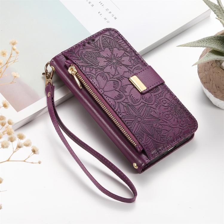 Funda de cuero con cremallera y correa para Samsung Galaxy S24 Ultra 5G, diseño de flores y hojas (morado)