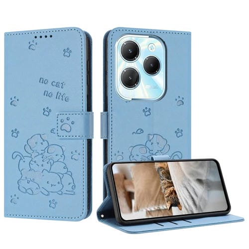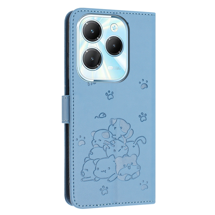 Funda de Cuero para Tecno Spark 20 Pro con Diseño de Gatito en Relieve y Cordón (Azul)