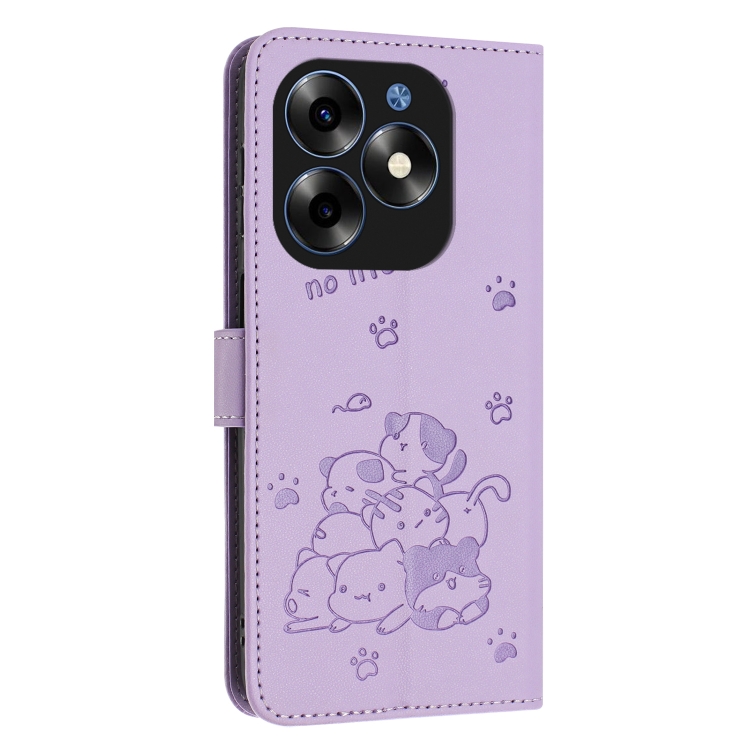 Funda de Cuero Itel S23+ con Diseño de Gatito en Relieve y Cordón (Morado)