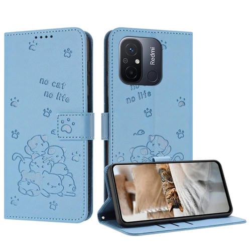 Funda de Piel con Diseño de Gatito En Relieve y Cordón para Xiaomi Poco C55 (Azul)
