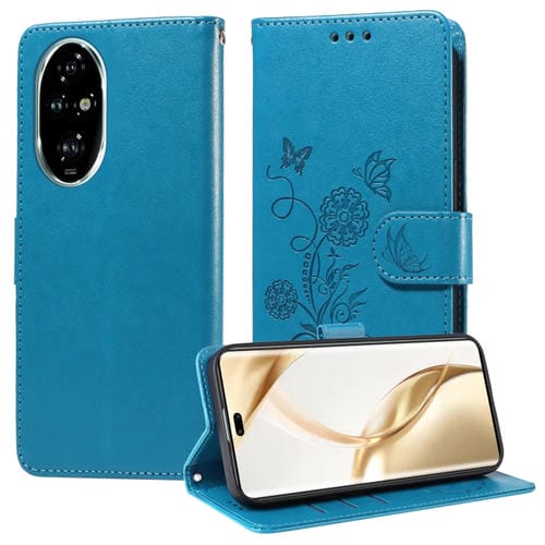 Funda de Cuero Honor 200 Pro con Diseño de Mariposas y Flores en Relieve (Azul)
