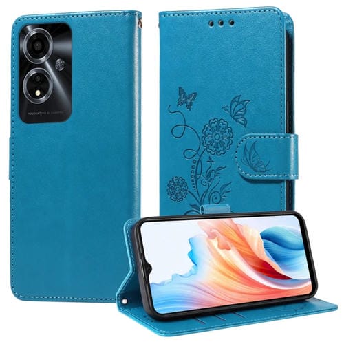 Funda de Cuero con Diseño de Mariposas y Flores En Relieve para Oppo A59 5G (Azul)