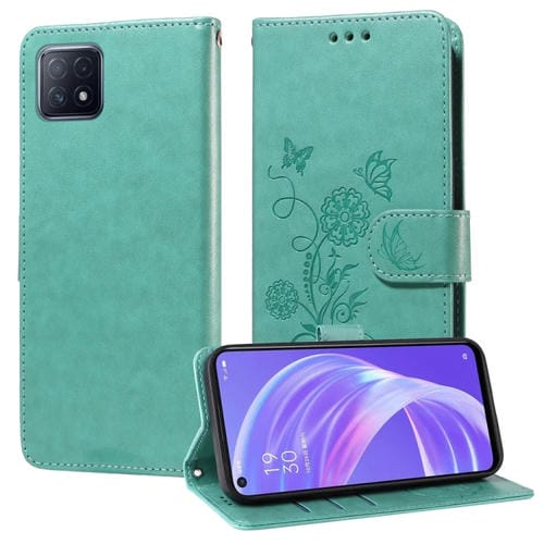 Funda de Cuero con Diseño de Mariposas y Flores En Relieve para Oppo A92S/A53 5G/A72 5G/A73 5G (Verde)