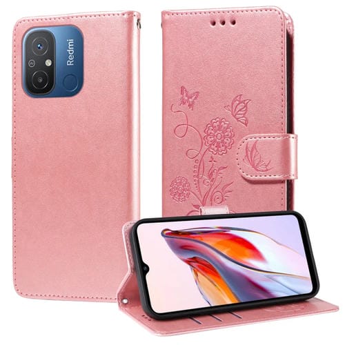 Funda de Cuero con Diseño de Mariposas y Flores En Relieve para Xiaomi Poco C55/Redmi 11A 4G (Oro Rosa)