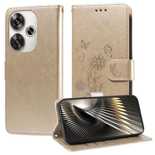 Funda de Cuero con Diseño de Mariposas y Flores En Relieve para Xiaomi Poco F6 (Dorada)