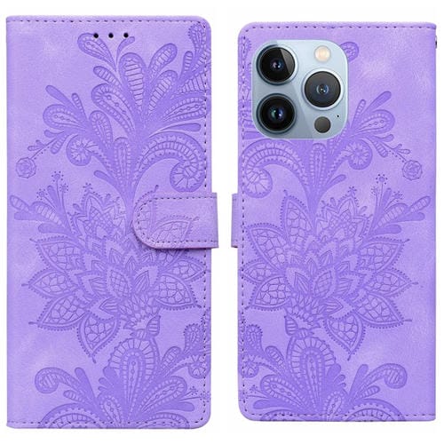 Funda de Cuero iPhone 14 Pro Max Hebilla Magnética Diseño Floral (Morado)