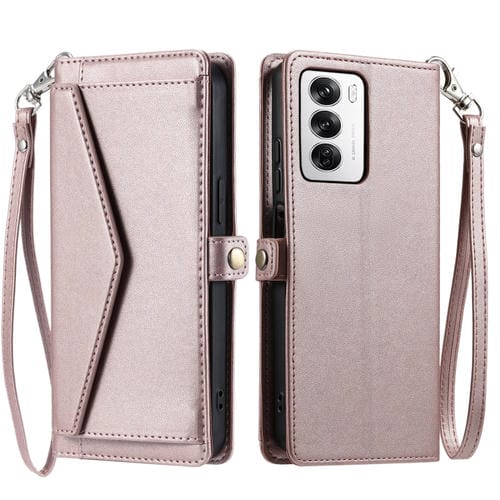 Funda de Cuero con Ranura para Múltiples Tarjetas y Billetera Global para Oppo Reno12 5G con Cordón (Oro Rosa)