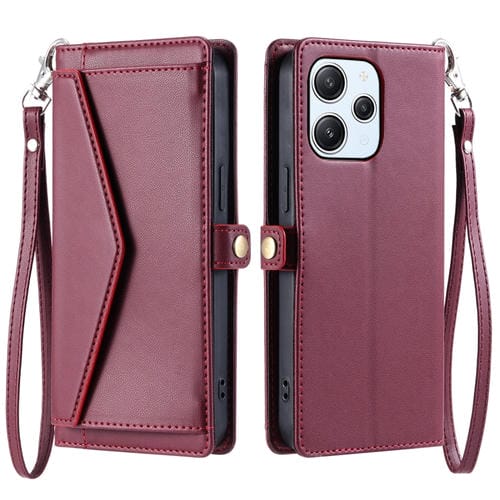 Funda de Cuero con Ranura para Múltiples Tarjetas y Cordón para Redmi Note 12R (Rojo Vino)