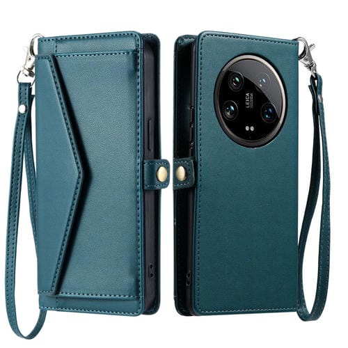 Funda De Cuero Con Ranura Para Múltiples Tarjetas Y Cordón Para Xiaomi 14 Ultra 5G (Verde)