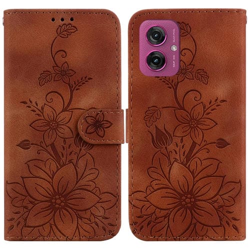 Funda de Cuero con Relieve de Lirios para Motorola Moto G55 (Marrón)