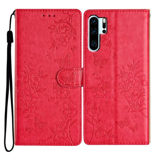 Funda de Cuero con Relieve Mariposa y Flor para Huawei P30 Pro (Rojo)