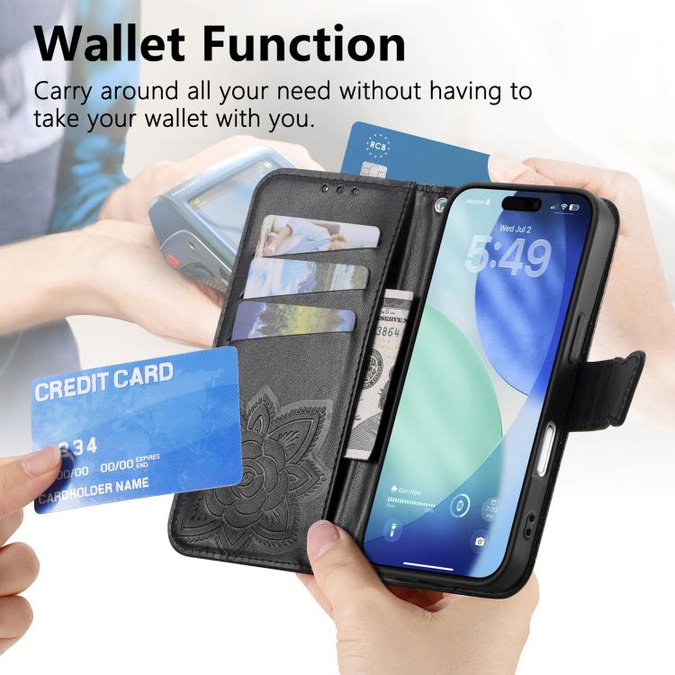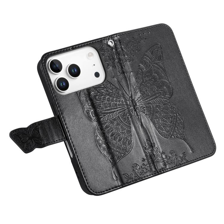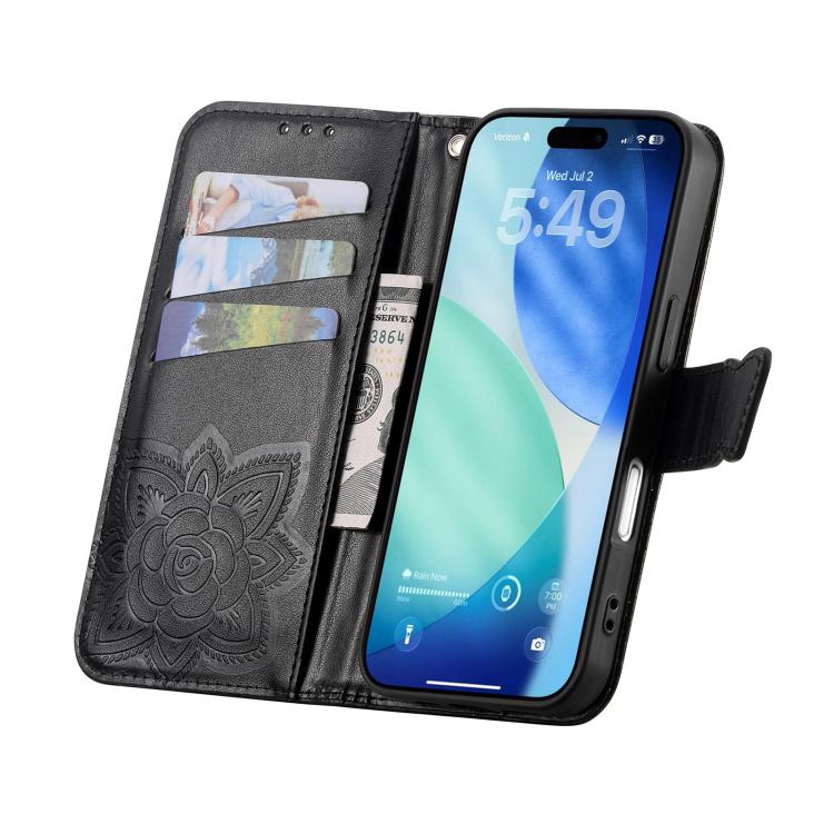 Funda de cuero con relieve de mariposa y flor para iPhone 17 Pro Max (negra)