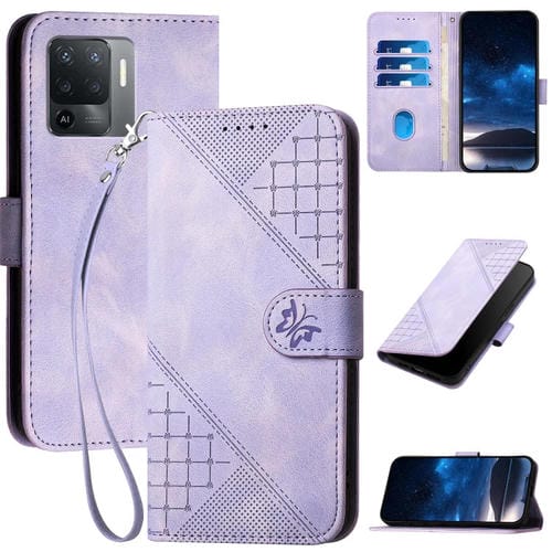 Funda de Cuero con Tapa y Cordón para Oppo Reno5 F 4G / Reno5 Lite Yx0080 con Diseño En Relieve de Mariposa y Cuadrícula (Morado Claro)