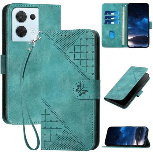 Funda de Cuero con Tapa y Cordón para Oppo Reno8 5G Global Yx0080 con Diseño En Relieve de Mariposa y Cuadrícula (Azul Claro)