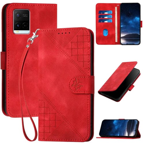 Funda de Cuero con Tapa y Cordón para Vivo Y21 / Y33S / Y21S Yx0080 con Diseño En Relieve de Mariposa y Cuadrícula (Rojo)