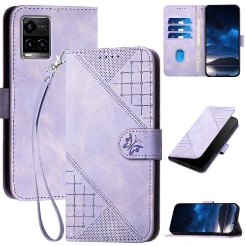 Funda de Cuero con Tapa y Cordón para Vivo Y21S/Y21T Yx0080 con Diseño En Relieve de Mariposa y Cuadrícula (Morado Claro)