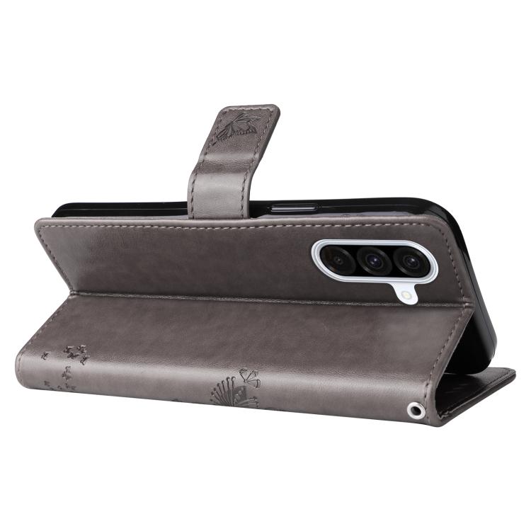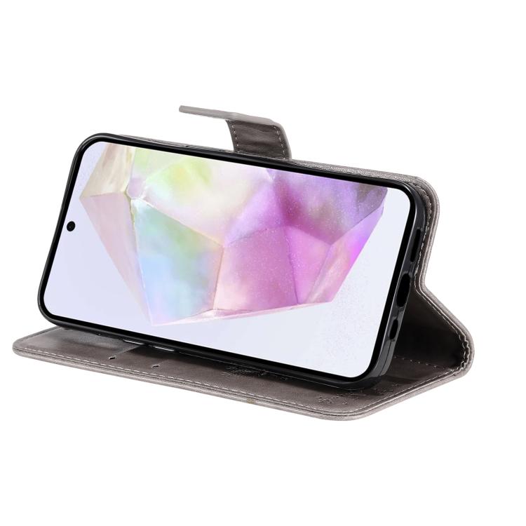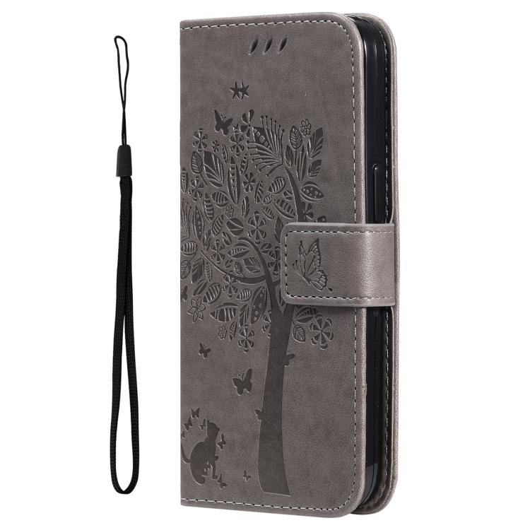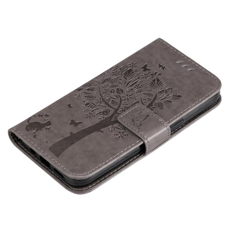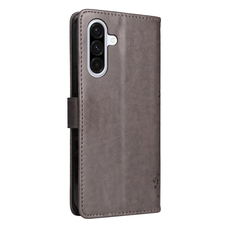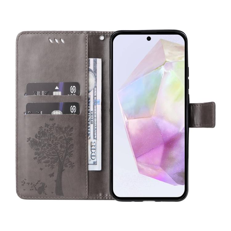 Funda de cuero con tapa y estampado de árbol y gato para Samsung Galaxy A36 5G / M56 5G (gris)