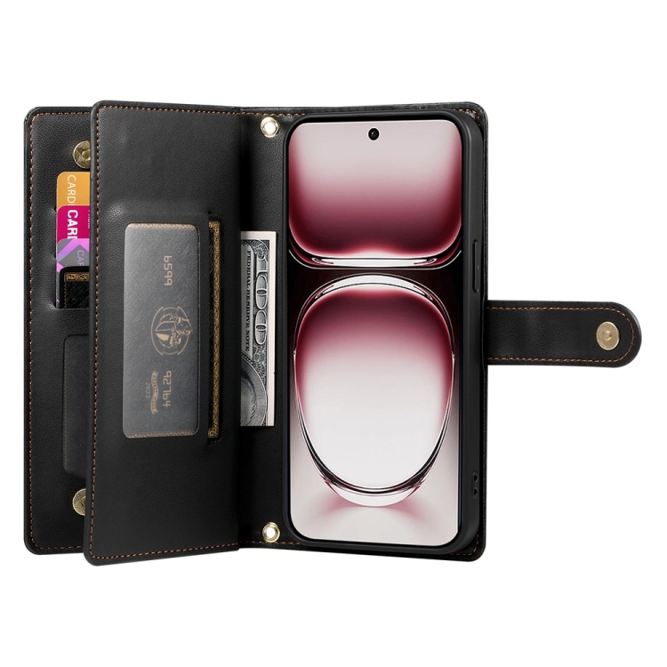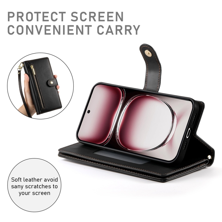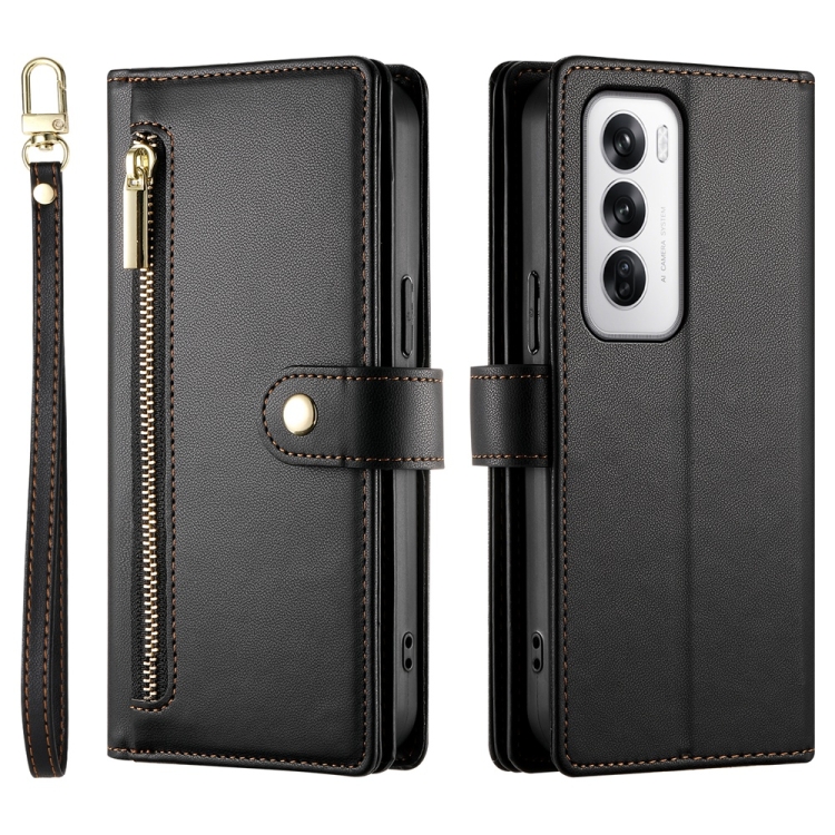 Funda de Cuero para Teléfono con Nueve Ranuras para Tarjetas y Cremallera para Oppo Reno12 Global (Negro)
