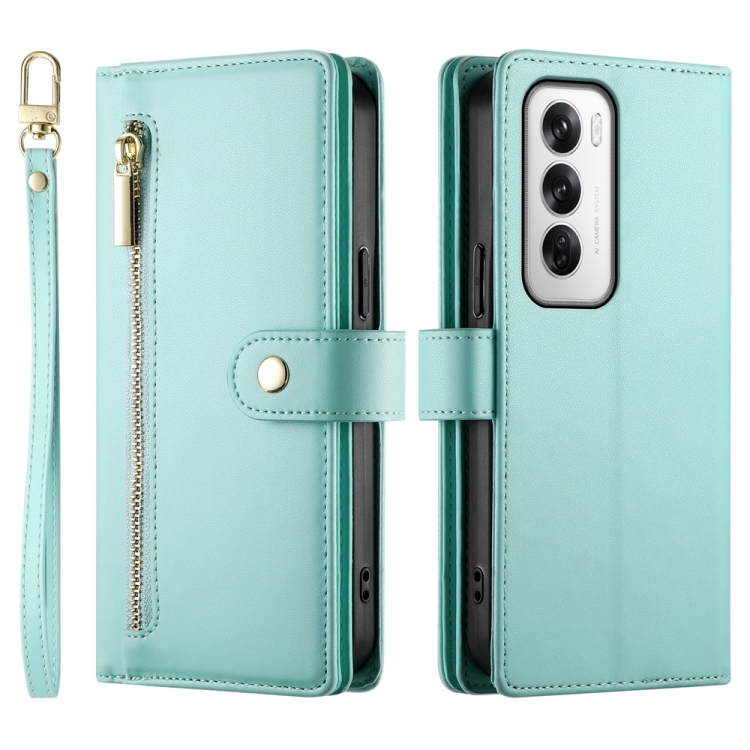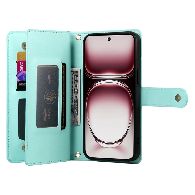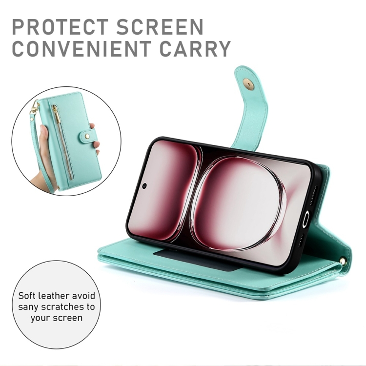 Funda de Cuero para Teléfono con Nueve Ranuras para Tarjetas y Cremallera para Oppo Reno12 Global (Verde Menta)