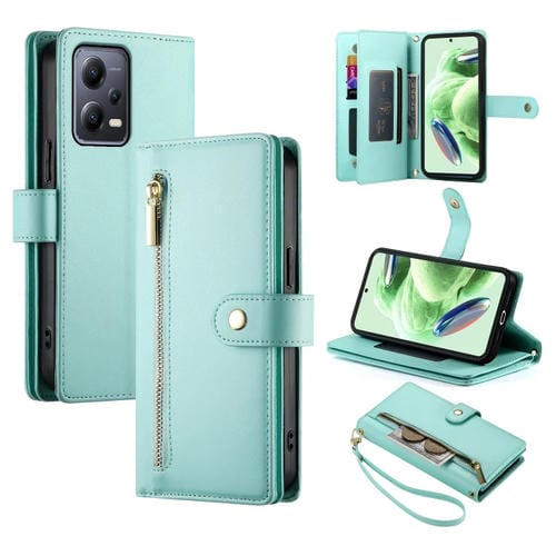Funda de Cuero para Teléfono con Nueve Ranuras para Tarjetas y Cremallera para Redmi Note 12 5G/Xiaomi Poco X5 (Verde Menta)