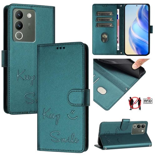 Funda de Cuero Rfid con Relieve de Sonrisa Global para Vivo Y200 5G (Verde Pavo Real)