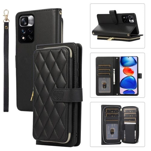 Funda de Cuero Tipo Billetera con Cremallera Completa y Diseño Rombal para Redmi Note 11 Pro (Negra)