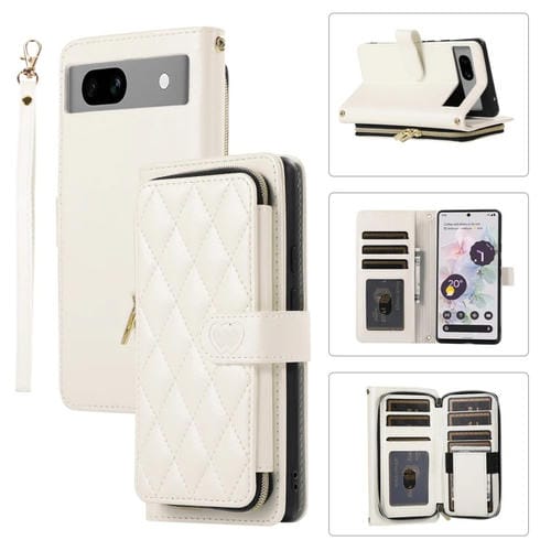 Funda Cuero Tipo Billetera con Cremallera Completa y Diseño Romboidal para Google Pixel 7A (Blanca)