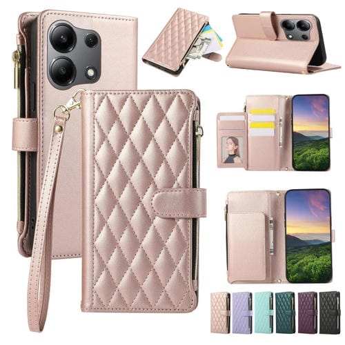 Funda de Cuero Tipo Billetera con Cremallera Rombal para Redmi Note 13 4G (Oro Rosa)