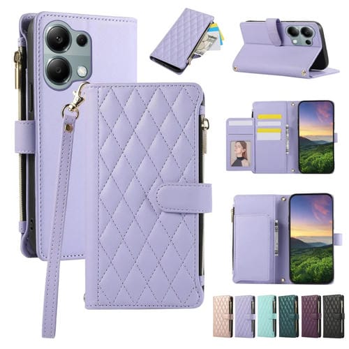 Funda de Cuero Tipo Billetera con Cremallera Rombal para Redmi Note 13 Pro 4G (Morado)