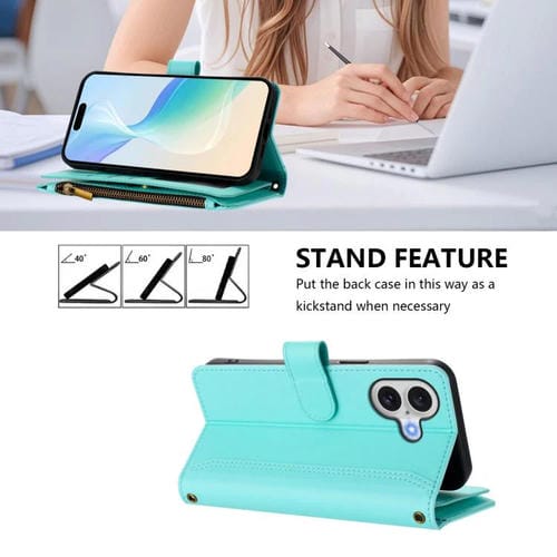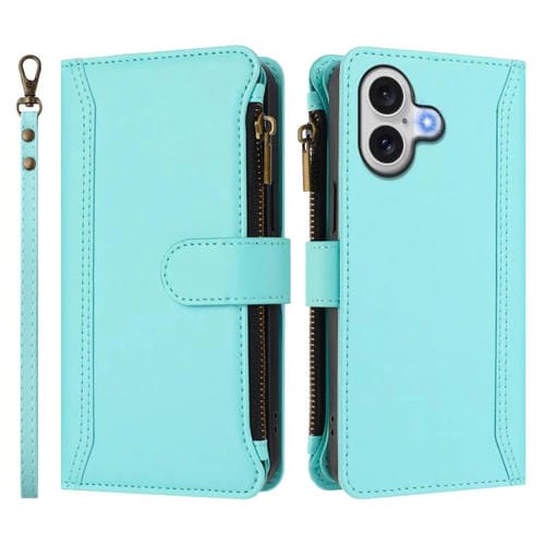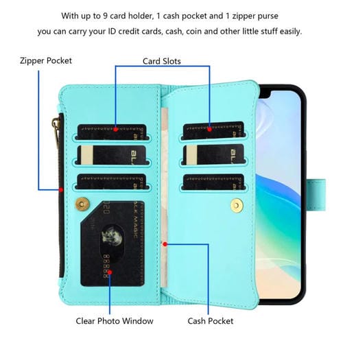 Funda de piel con cierre magnético para iPhone 17, 9 ranuras para tarjetas, cremallera y correa de mano (verde menta)