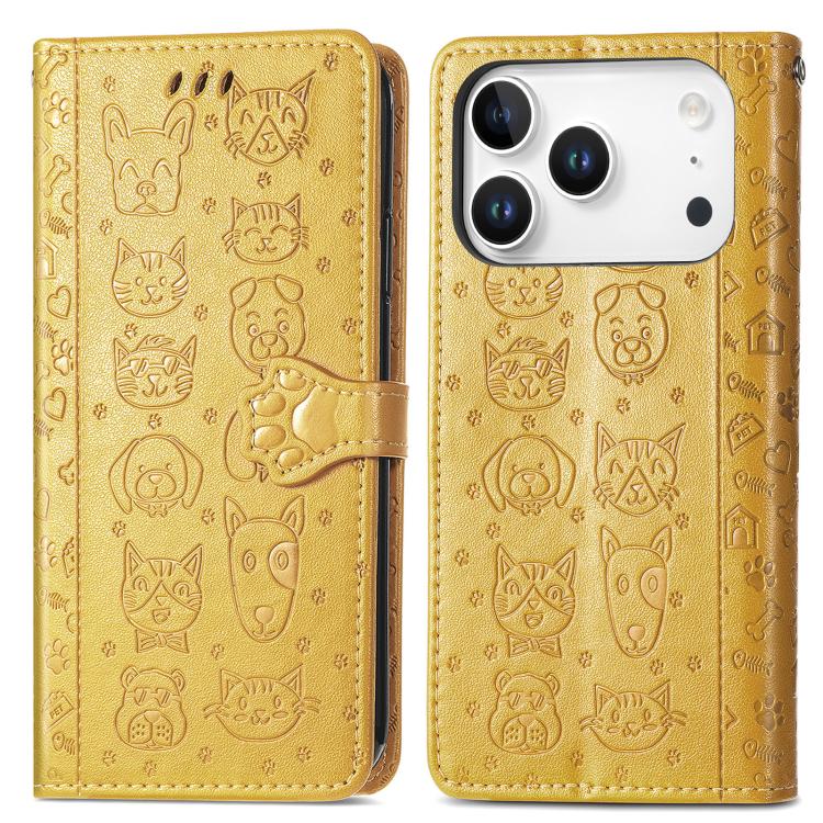Funda de piel con estampado de gato y perro para iPhone 17 Pro (amarilla)