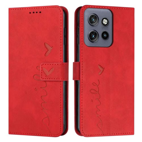 Funda de Piel con Relieve de Corazón para Motorola Edge 50 Neo con Cordón Largo (Rojo)