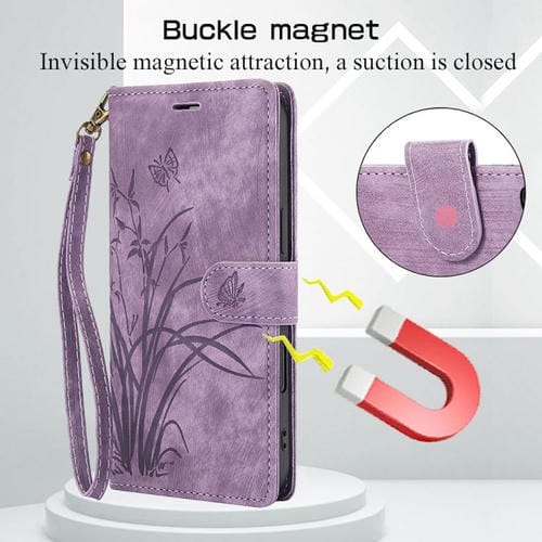 Funda de piel con relieve de mariposa y orquídea para iPhone 17 (morada)