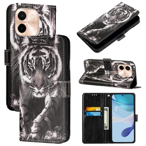 Funda de Teléfono de Cuero con Patrón de Dibujo de Colores de Tejido Liso para Vivo Y28 4G (Tigre Blanco y Negro)